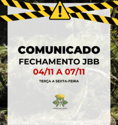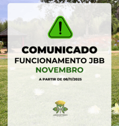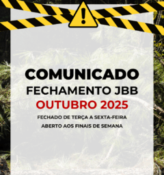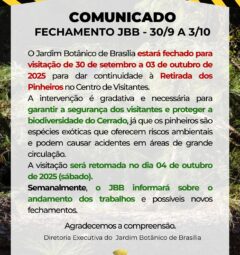 JBB – Fechado de 30/9 a 3/10 COMUNICADO O Jardim Botânico de Brasília ficará fechado para visitação de 30 de setembro a 3 de outubro de 2025, para continuidade da retirada dos pinheiros no Centro de Visitantes....