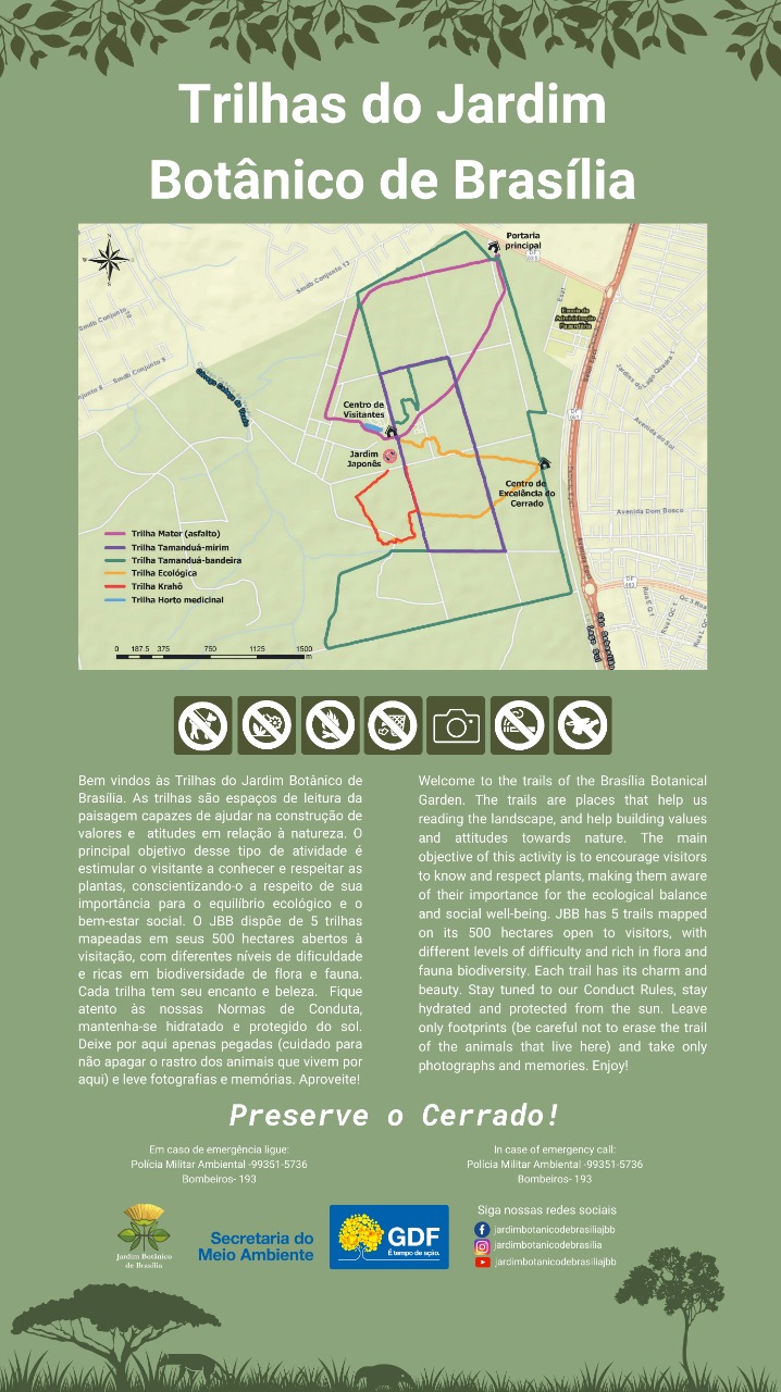 É a primeira trilha do Jardim Botânico de Brasília (JBB), asfaltada e com acessibilidade para pessoas com deficiência. Começa na portaria principal atravessando vários tipos de vegetação de Cerrado (denso, típico e ralo), passando pelo Centro de Visitantes, pelo Anfiteatro, retornando à portaria principal, por uma galeria formada por árvores de Cerrado denso. A vegetação possui ampla identificação botânica, proporcionando visitação autoguiada.